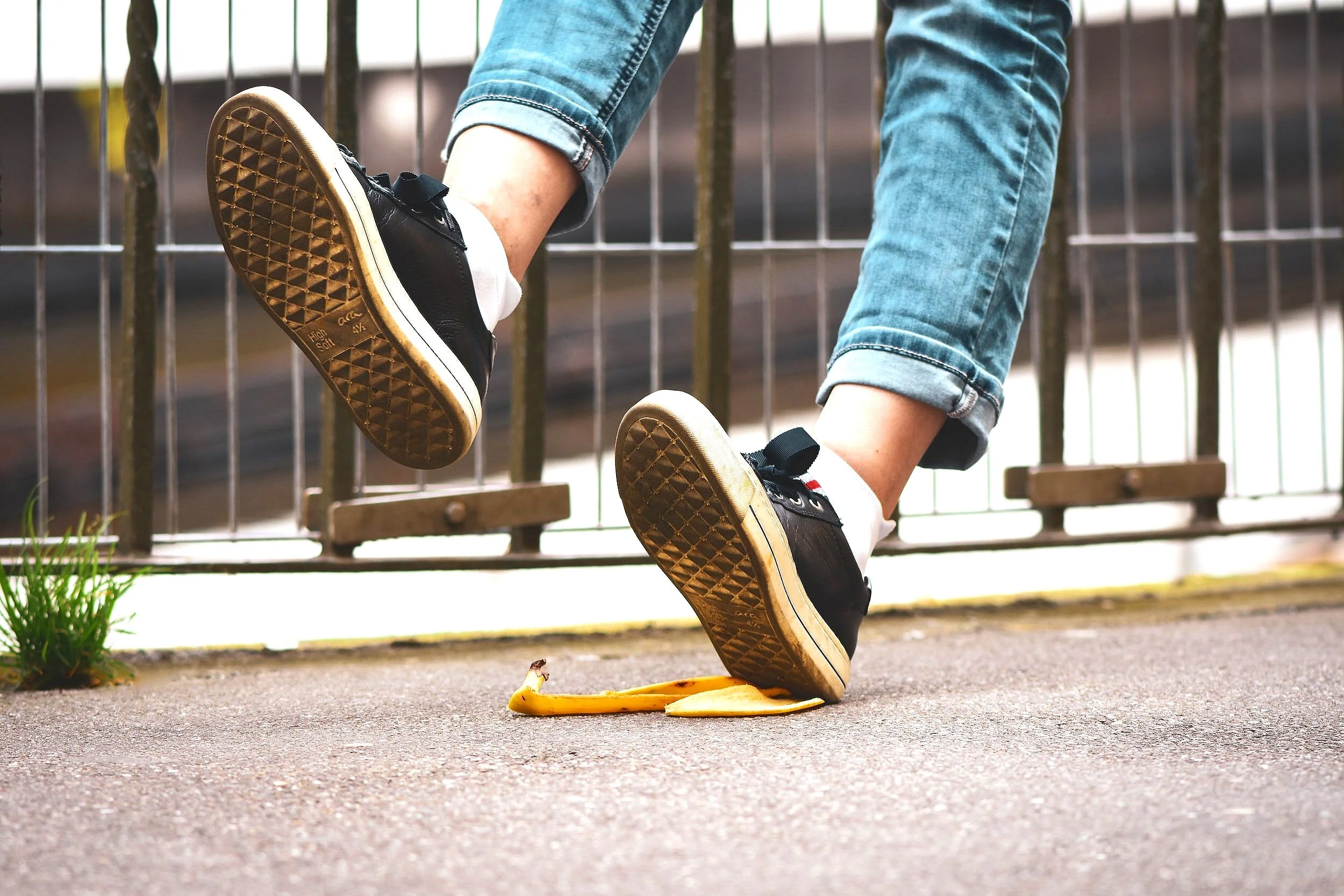 A banana peel slip with the left foot leads into another with the right. Chevy Chase would be proud.