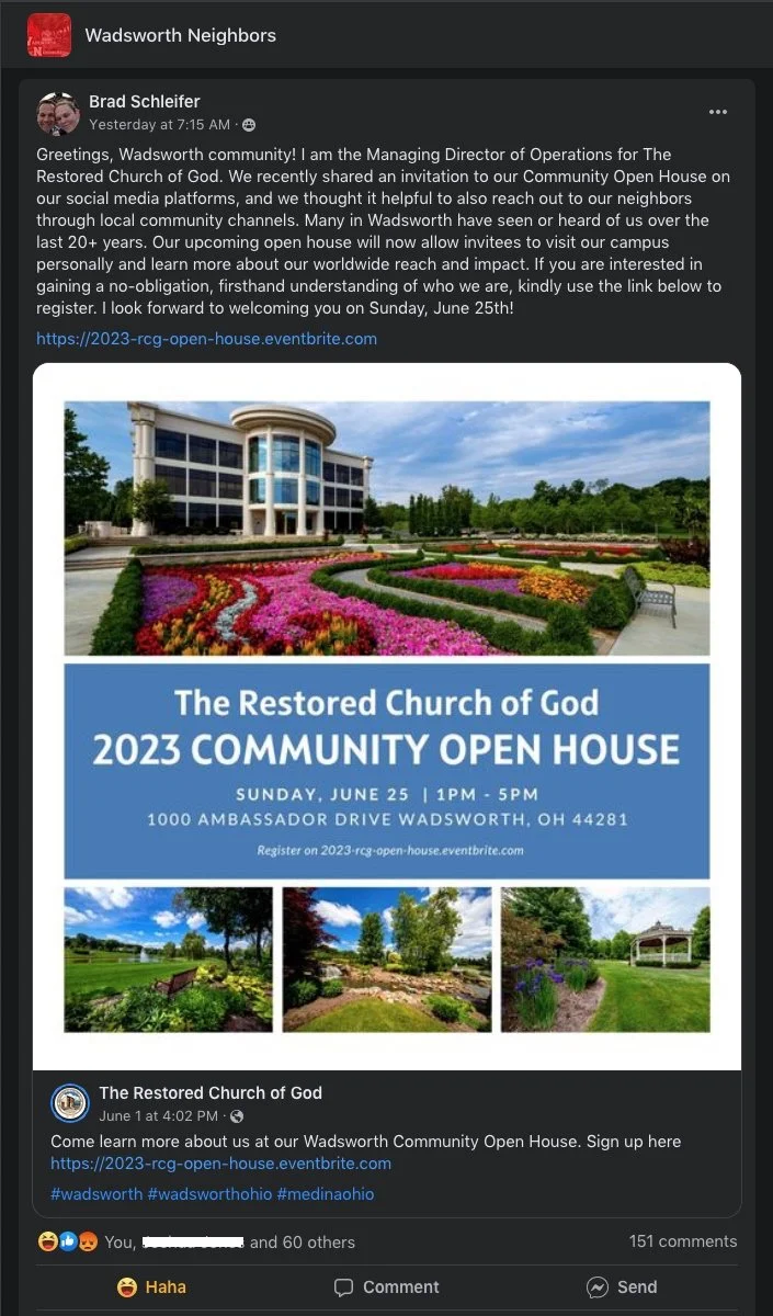 In a bold move, Pseudo Evangelist Bradford G. Schleifer waded into the shark-infested waters of social media this week by announcing a 2023 Restored Church of God Open House taking place on June 25. It was posted on RCG’s main Facebook feed and the two private Wadsworth Neighbors groups.
